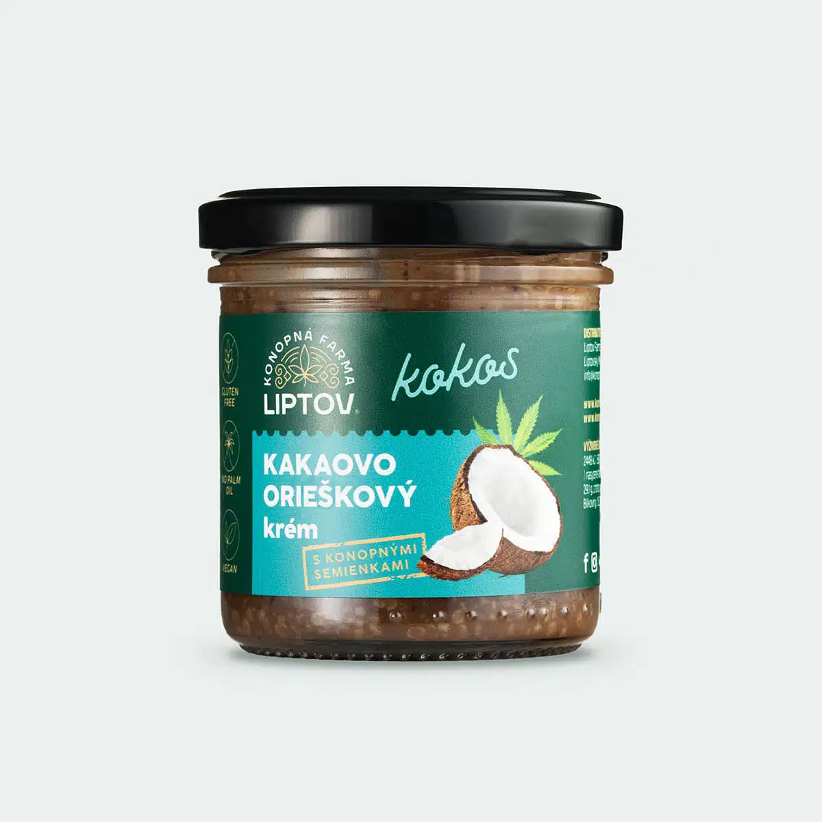 Složení: kakaový krém (50 %) (cukr, lískové oříšky, mandle, kakaový prášek, řepkový olej), loupaná konopná semínka (30 %), kokosová pasta (20 %)